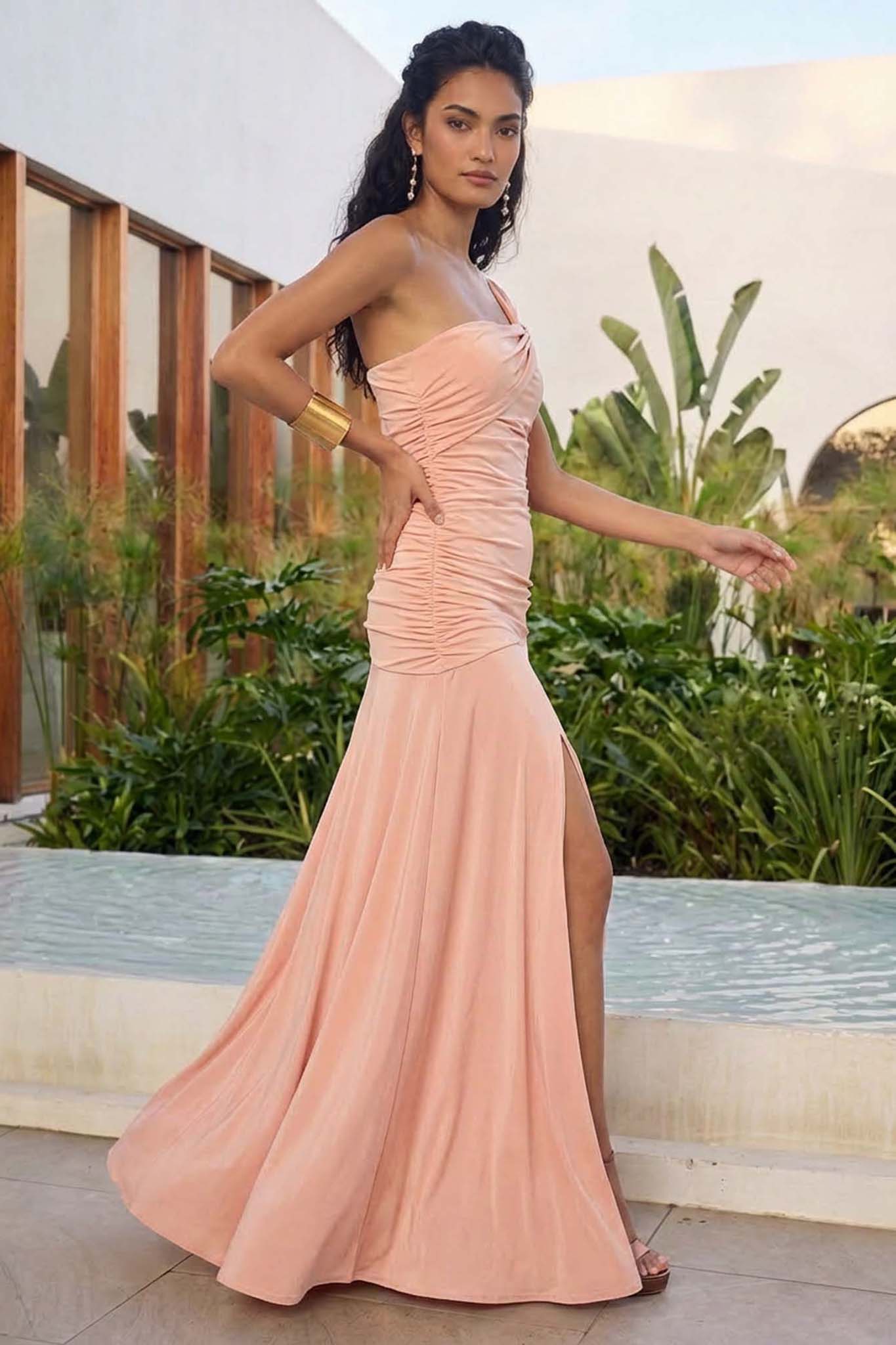 Φόρεμα μάξι από ελαστικό ζέρσευ, με cups στο στήθος, ασύμμετρο ντεκολτέ με έναν ώμο και σκίσιμο στο πλάι. Προσφέρει ένα αέρινο και κομψό αποτέλεσμα. Ιδανικό για επίσημες εμφανίσεις. Μήκος 135cm στήθος 42cm
