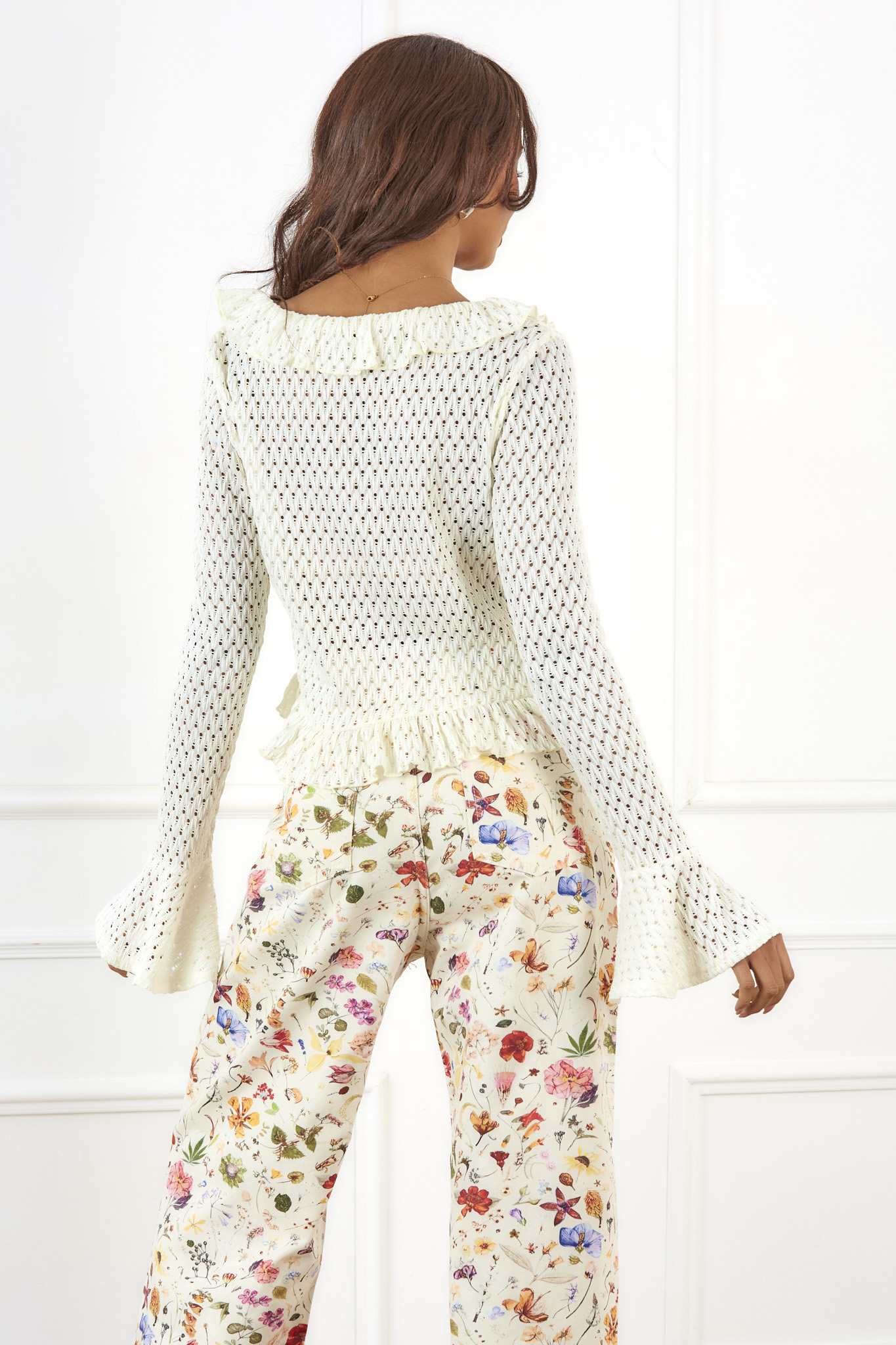 Mπλούζα πλεκτή με βολάν. Προσθέστε μια δόση ρομαντισμού στις εμφανίσεις σας με αυτό το αιθέριο πλεκτό τοπ σε απαλό ροζ χρώμα. Ο συνδυασμός της ντελικάτης πλέξης pointelle με τα εντυπωσιακά βολάν δημιουργεί ένα κομμάτι που αποπνέει θηλυκότητα και στυλ, ιδανικό για ανοιξιάτικα και καλοκαιρινά outfits.