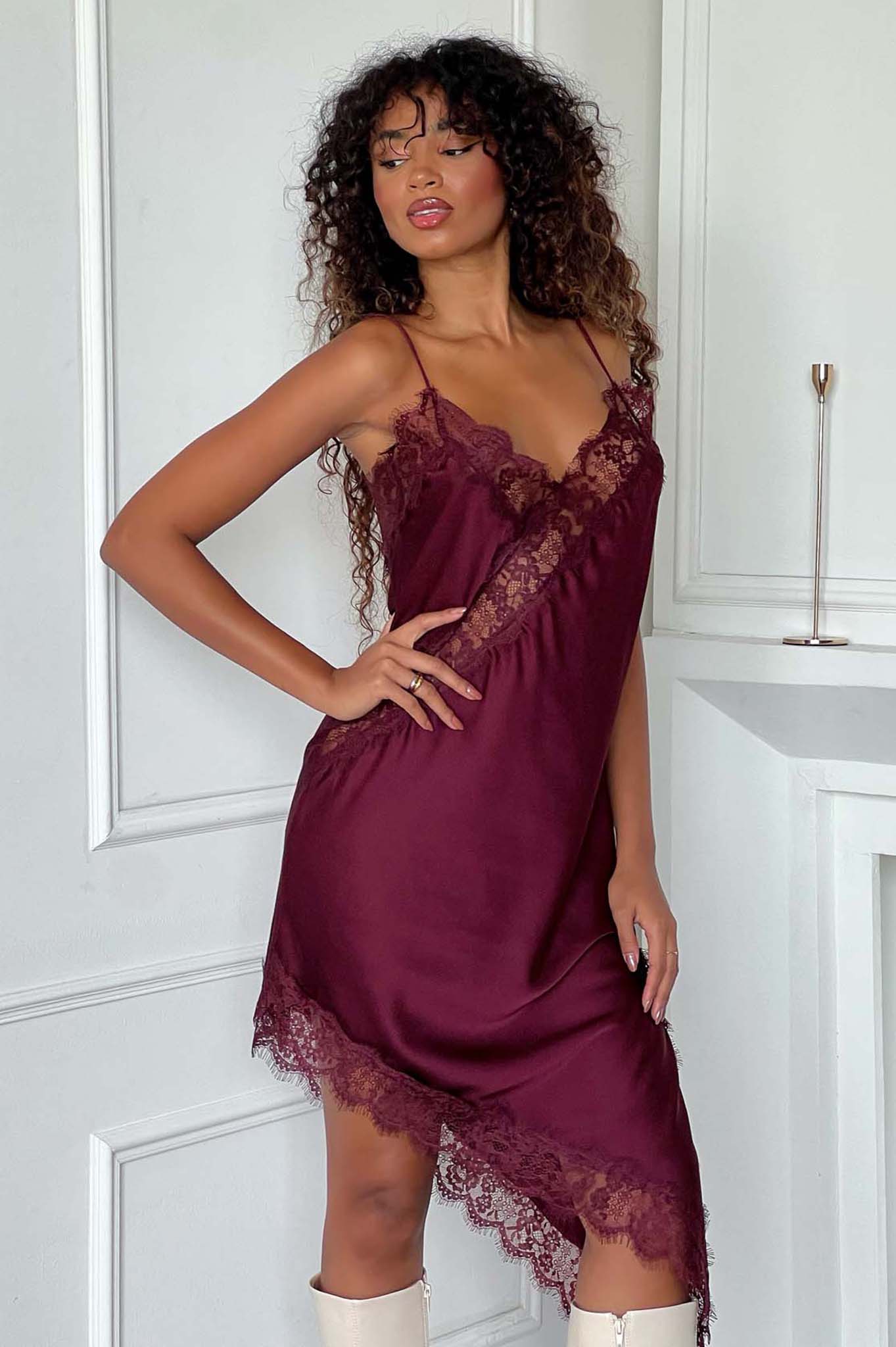 Σατέν φόρεμα με ασύμμετρο τελείωμα και δαντέλα. Περιφέρεια στήθους 84cm, περιφέρεια μέσης 98cm.
