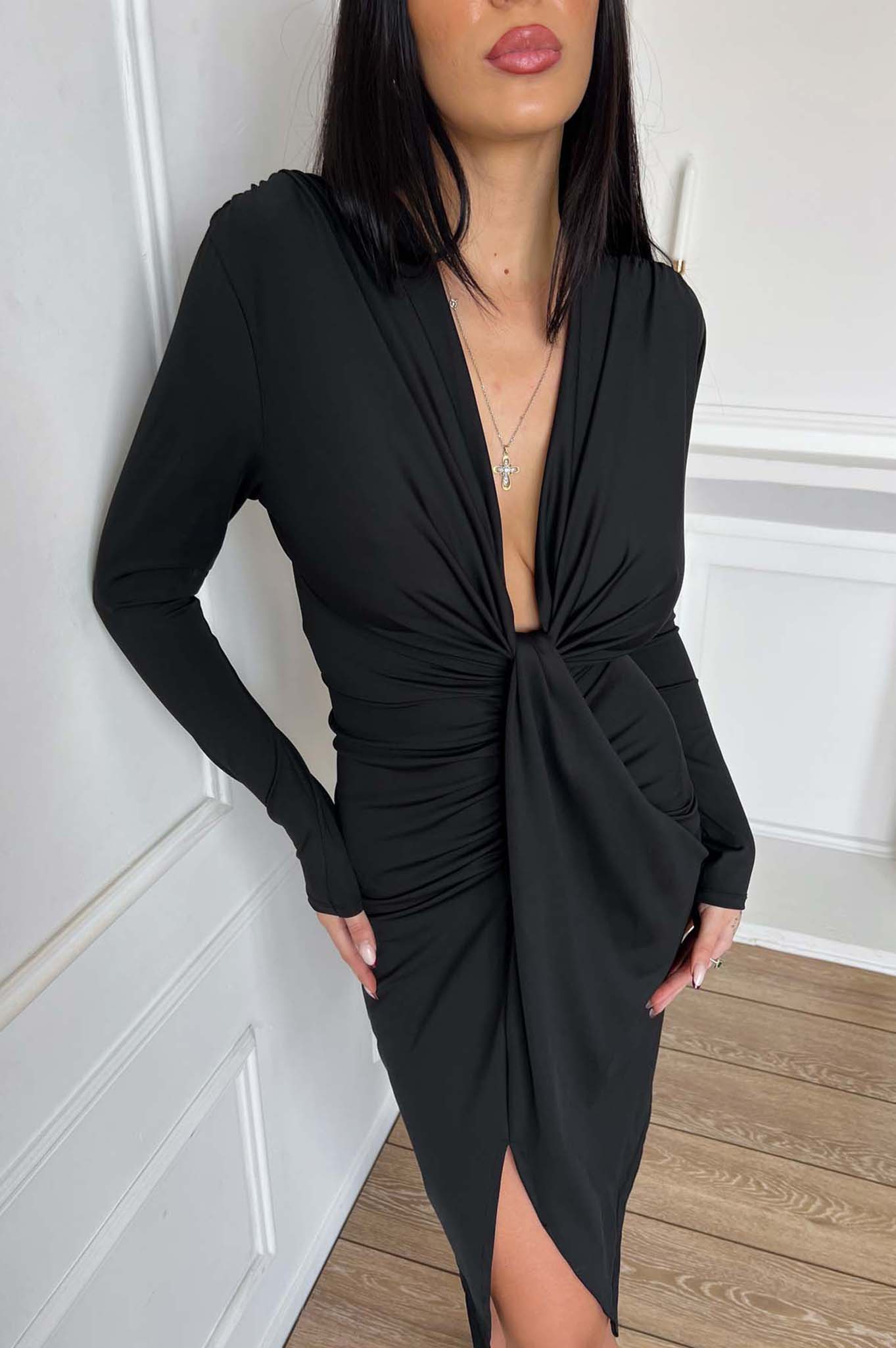 Μίντι φόρεμα φόρεμα με σούρες και σκίσιμο μπροστά που αναδεικνύει τη σιλουέτα. Μήκος 115cm, στήθος 45cm, μανίκι 60cm
