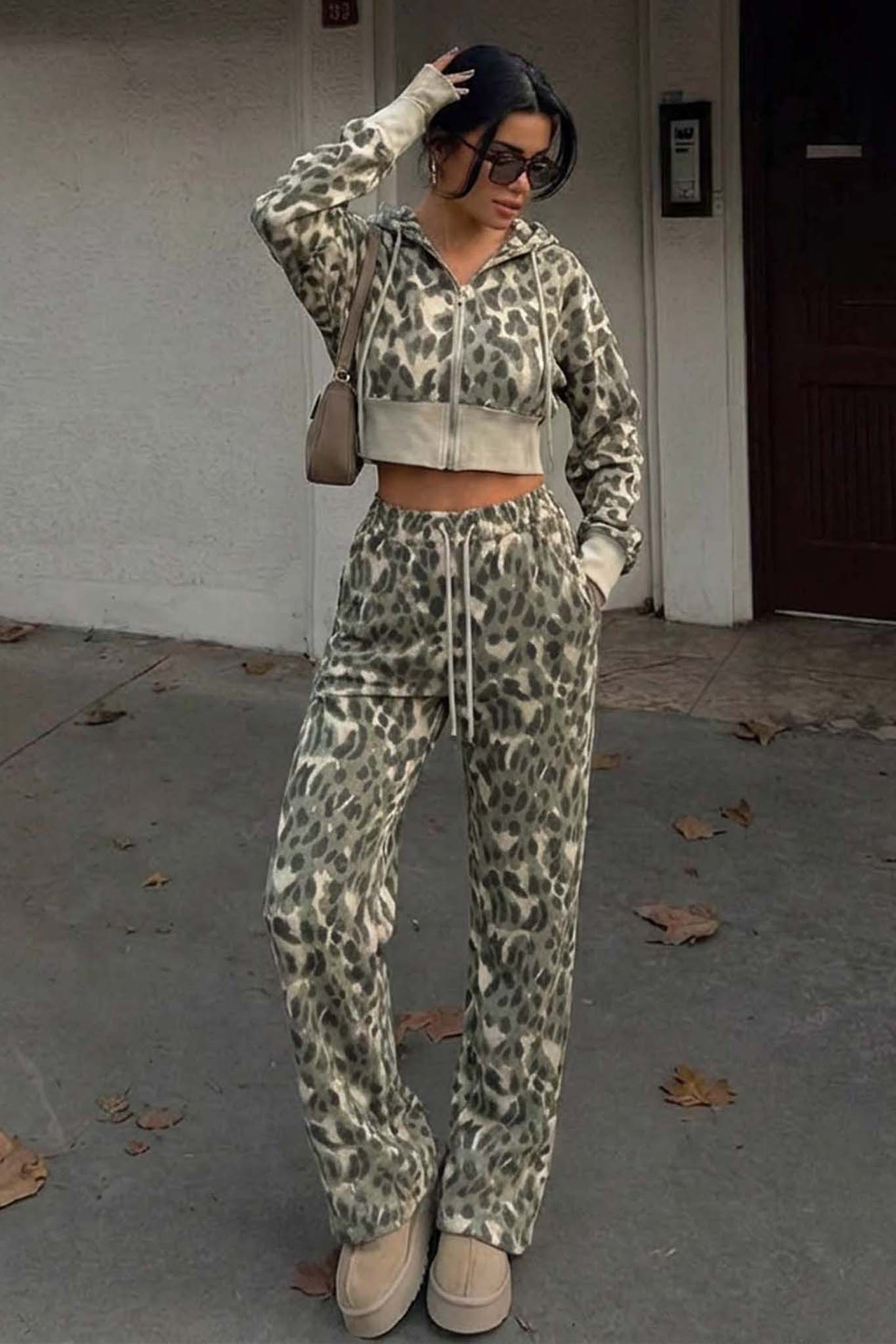 Αυτό το σετ φόρμας είναι ένα μοντέρνο και άνετο σύνολο δύο τεμαχίων, ιδανικό για casual εμφανίσεις με στυλ. Αποτελείται από μια κοντή (cropped) ζακέτα με κουκούλα και φερμουάρ, και ένα ασορτί ψηλόμεσο παντελόνι με φαρδιά γραμμή (wide leg). Το σύνολο κοσμείται από ένα εντυπωσιακό λεοπάρ μοτίβο σε ουδέτερες αποχρώσεις του χακί και του μπεζ.