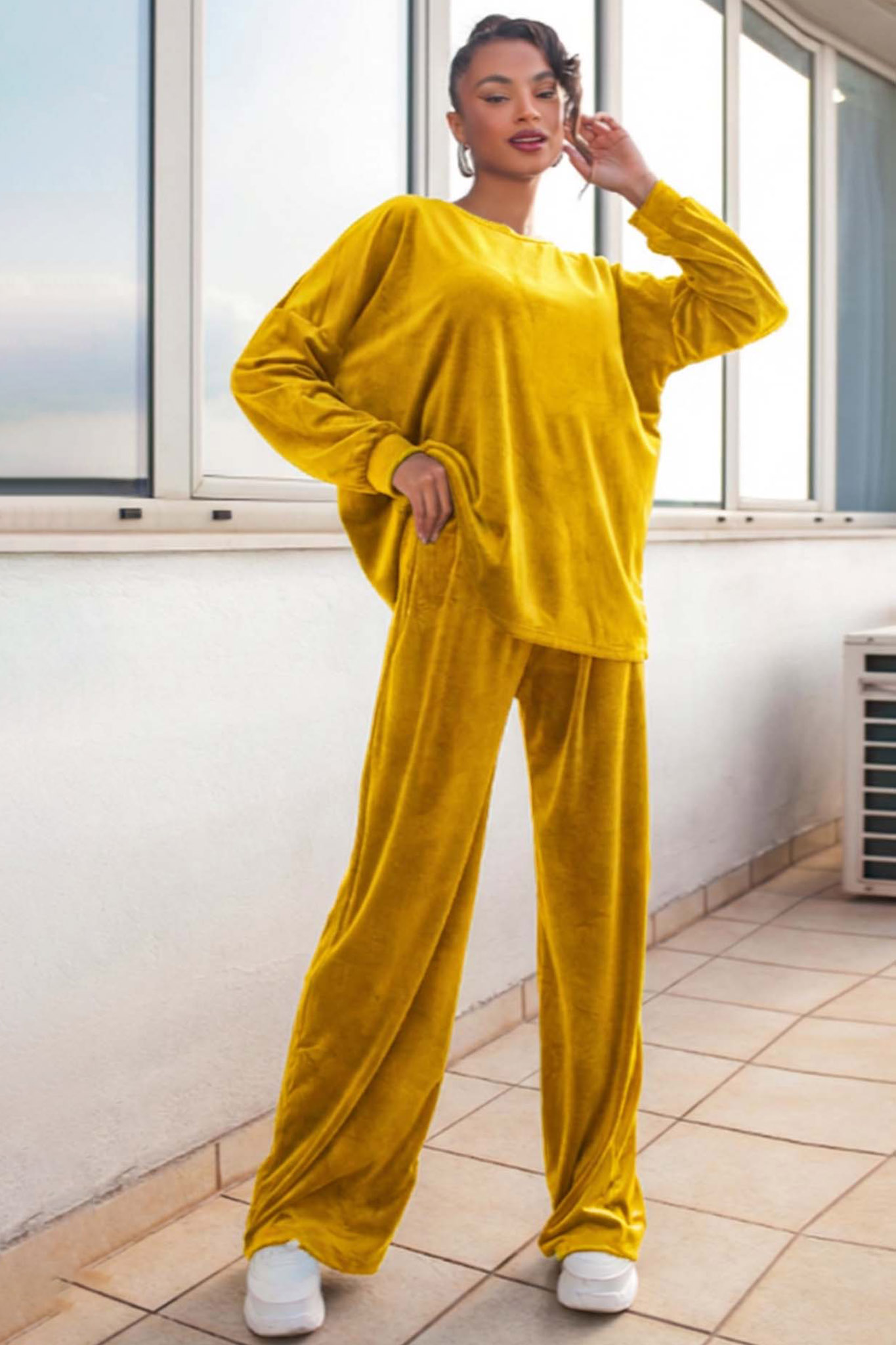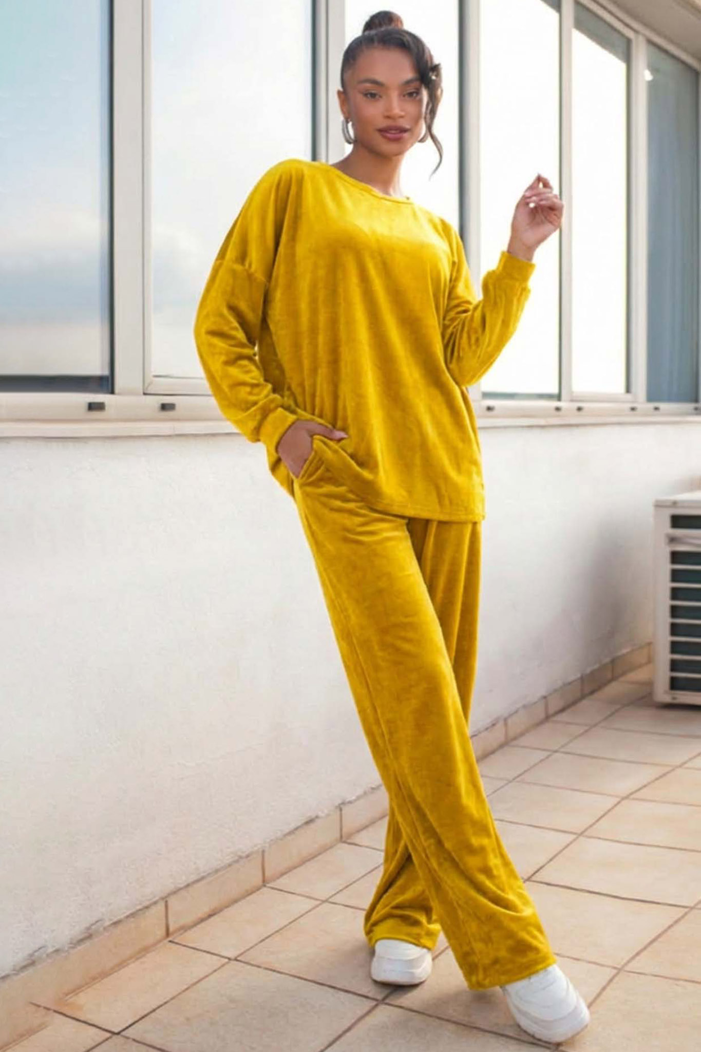 Σετ σε βελούδινη υφή με μπλούζα με μακριά μανίκια και στρογγυλή λαιμόκοψη. Παντελόνι σε ίσια γραμμή με λάστιχο στη μέση και κορδόνι. Εξαιρετικά άνετη εφαρμογή. Προσφέρει κομψό αλλά και cozy αποτέλεσμα. Ιδανικό για καθημερινές εμφανίσεις και χαλαρές βόλτες. Μπλούζα 66cm μανίκι 43cm στήθος 56cm πλάτη 80cm Παντελόνι Μήκος 106cm.