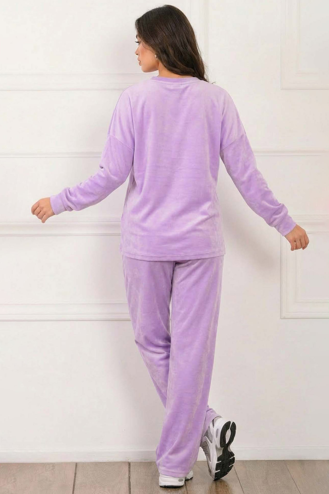Σετ σε βελούδινη υφή με μπλούζα με μακριά μανίκια και στρογγυλή λαιμόκοψη. Παντελόνι σε ίσια γραμμή με λάστιχο στη μέση και κορδόνι. Εξαιρετικά άνετη εφαρμογή. Προσφέρει κομψό αλλά και cozy αποτέλεσμα. Ιδανικό για καθημερινές εμφανίσεις και χαλαρές βόλτες. Μπλούζα 66cm μανίκι 43cm στήθος 56cm πλάτη 80cm Παντελόνι Μήκος 106cm.