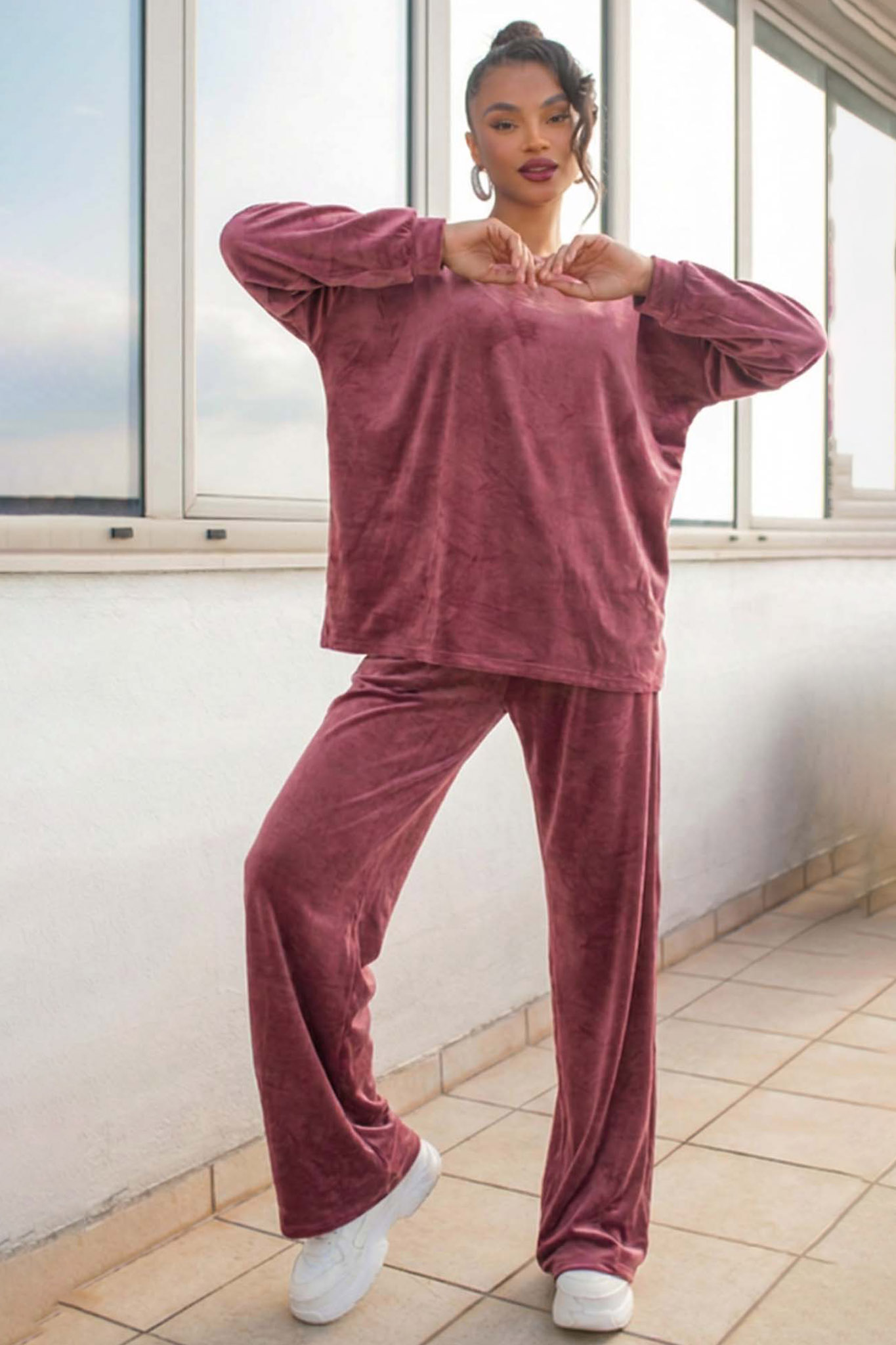 Σετ σε βελούδινη υφή με μπλούζα με μακριά μανίκια και στρογγυλή λαιμόκοψη. Παντελόνι σε ίσια γραμμή με λάστιχο στη μέση και κορδόνι. Εξαιρετικά άνετη εφαρμογή. Προσφέρει κομψό αλλά και cozy αποτέλεσμα. Ιδανικό για καθημερινές εμφανίσεις και χαλαρές βόλτες. Μπλούζα 66cm μανίκι 43cm στήθος 56cm πλάτη 80cm Παντελόνι Μήκος 106cm.