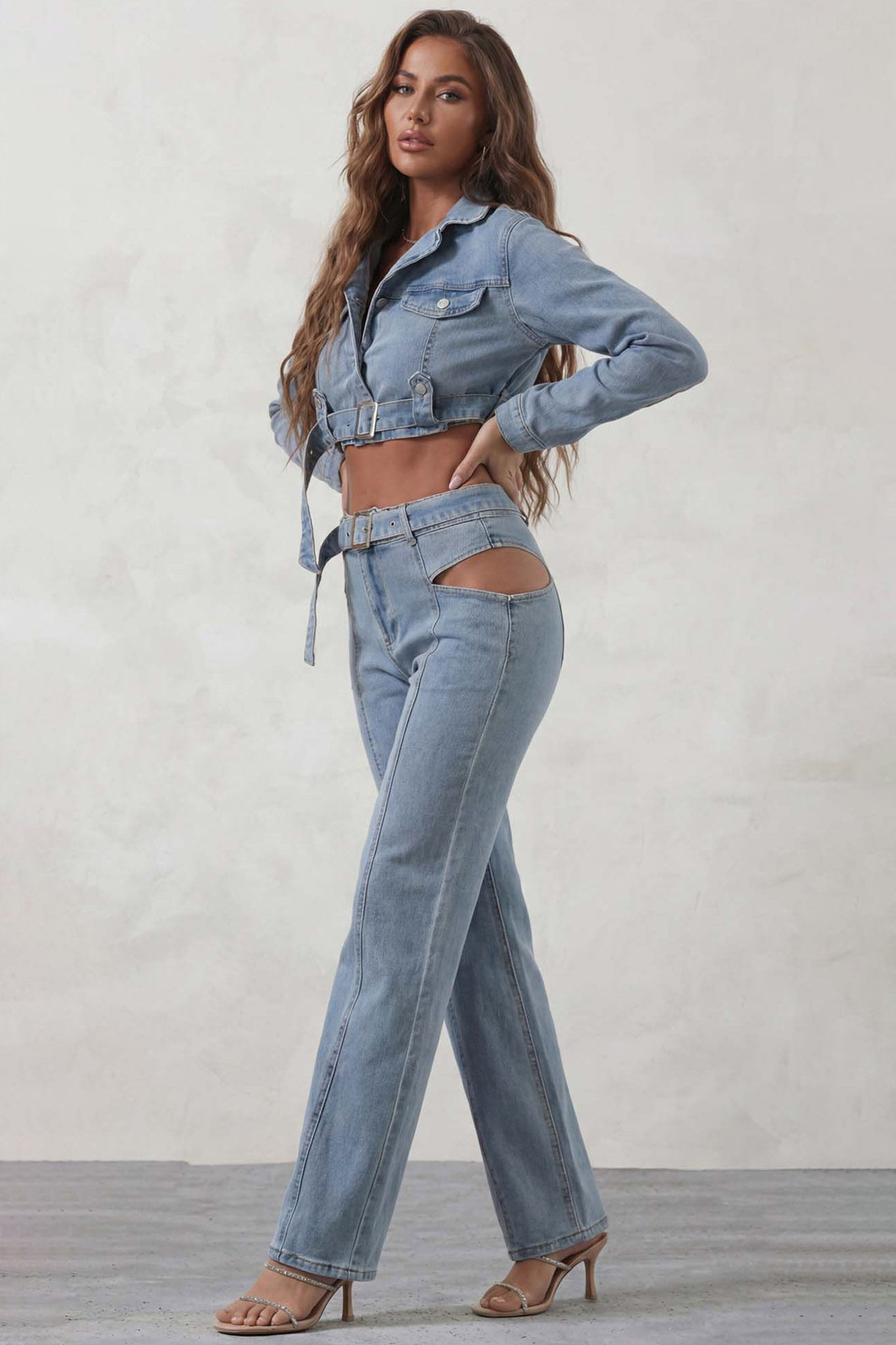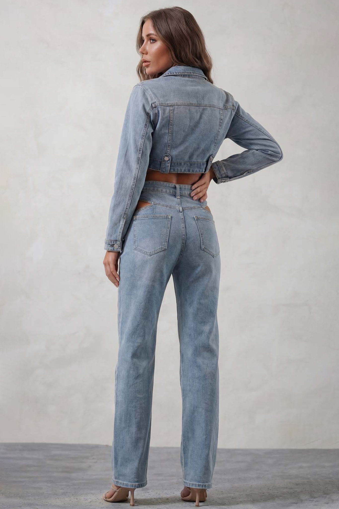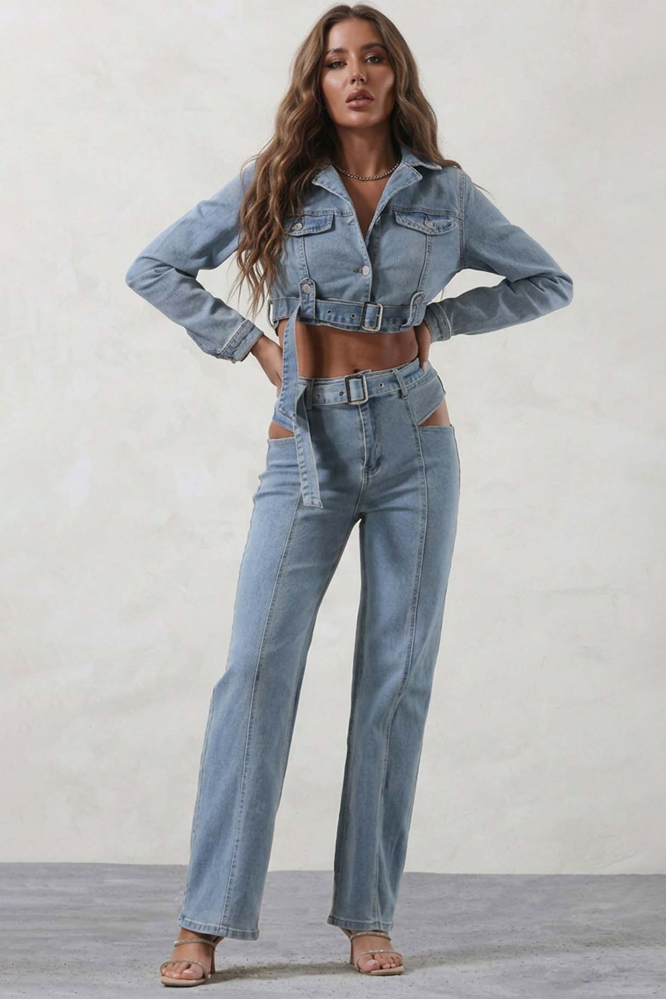 Κροπ τζιν τζάκετ και τζιν παντελόνι με cut out στο πλάι. Αυτό το σετ αποτελεί την απόλυτη έκφραση του σύγχρονου street style, συνδυάζοντας την 70s αισθητική με τολμηρές, μοντέρνες λεπτομέρειες.