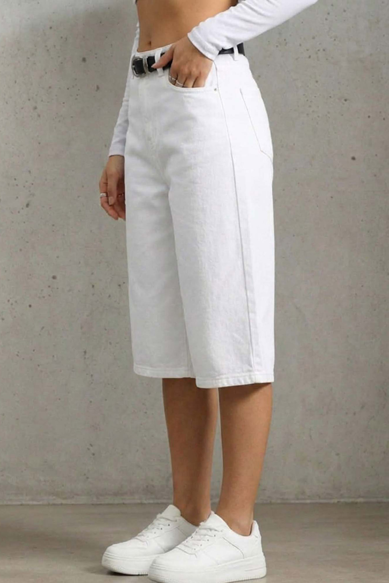 Τζιν βερμούδα με ζωνάκι στη μέση σε άνετη γραμμή. Ιδανικό για καθημερινές καλοκαιρινές εμφανίσεις.