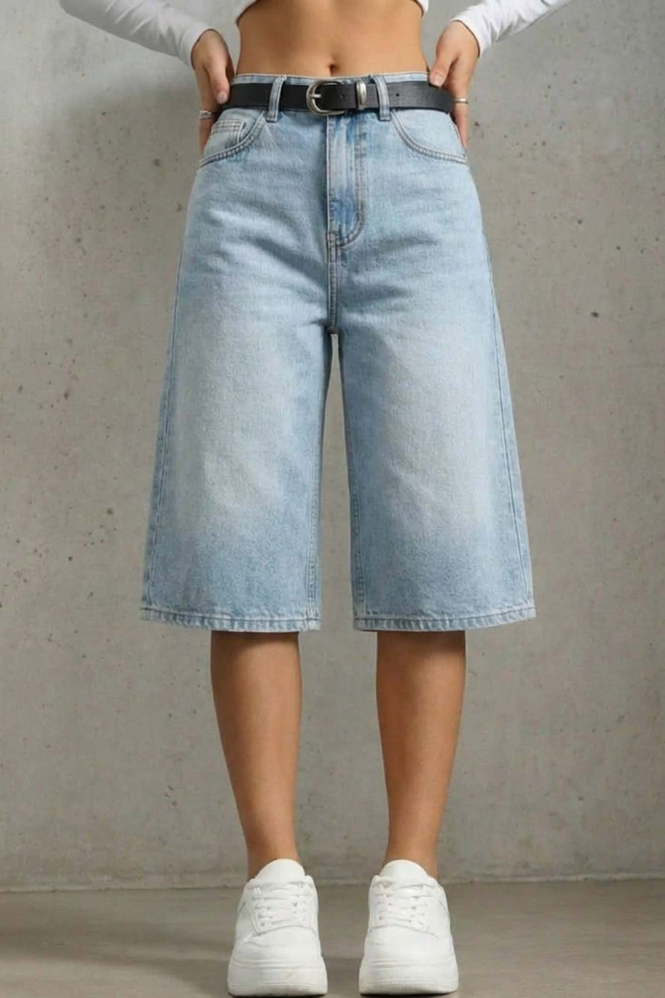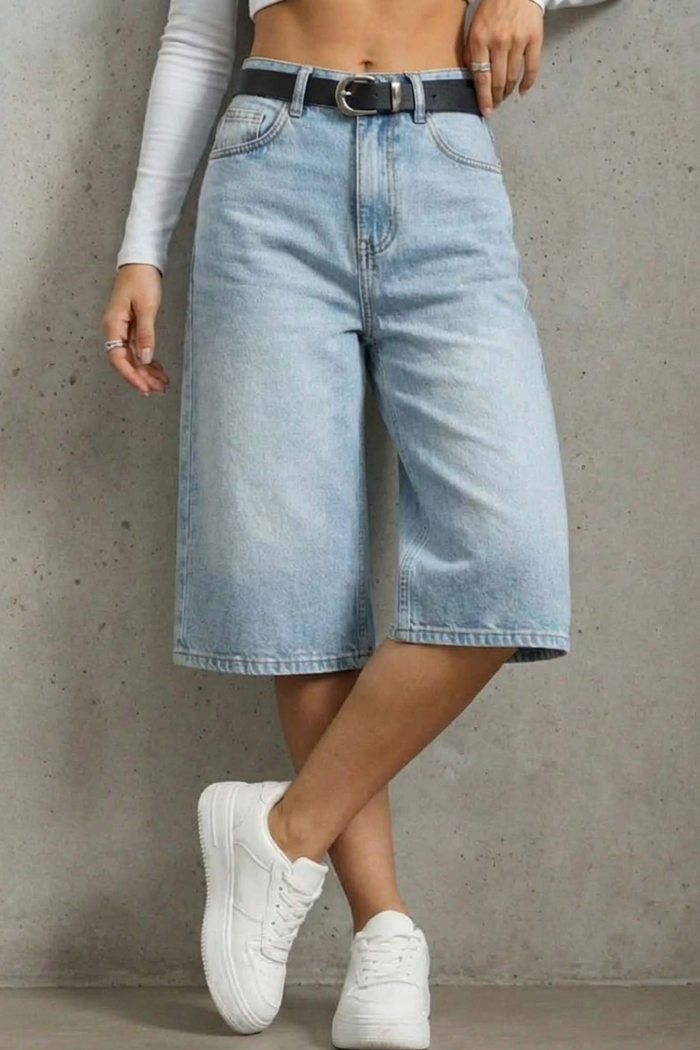 Τζιν βερμούδα με ζωνάκι στη μέση σε άνετη γραμμή. Ιδανικό για καθημερινές καλοκαιρινές εμφανίσεις.