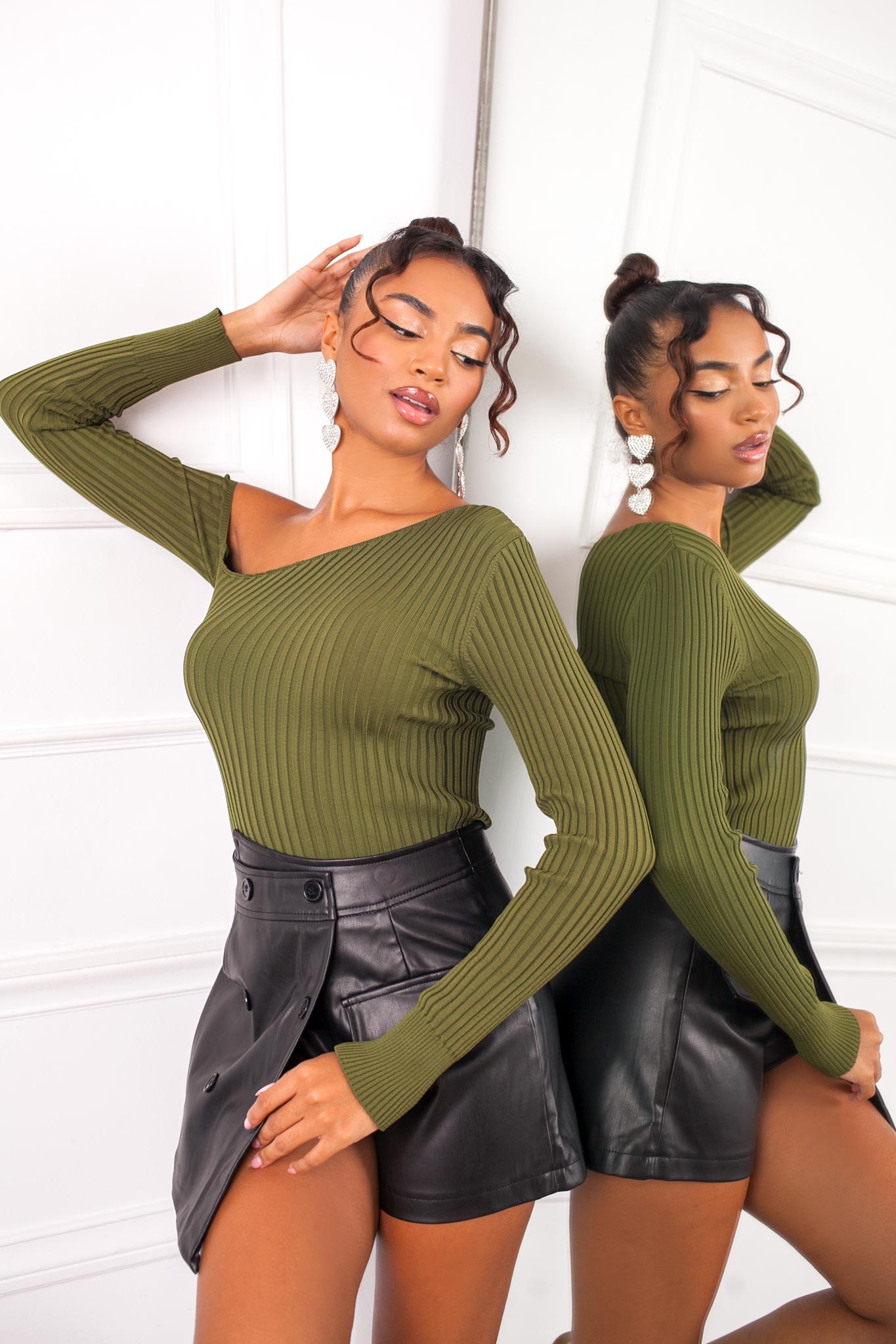Ριπ πλεκτό τοπ με μακριά μανίκια και ασύμμετρο κόψιμο στο ντεκολτέ. Μήκος 52cm Μανίκι 60cm Στήθος 26cm
