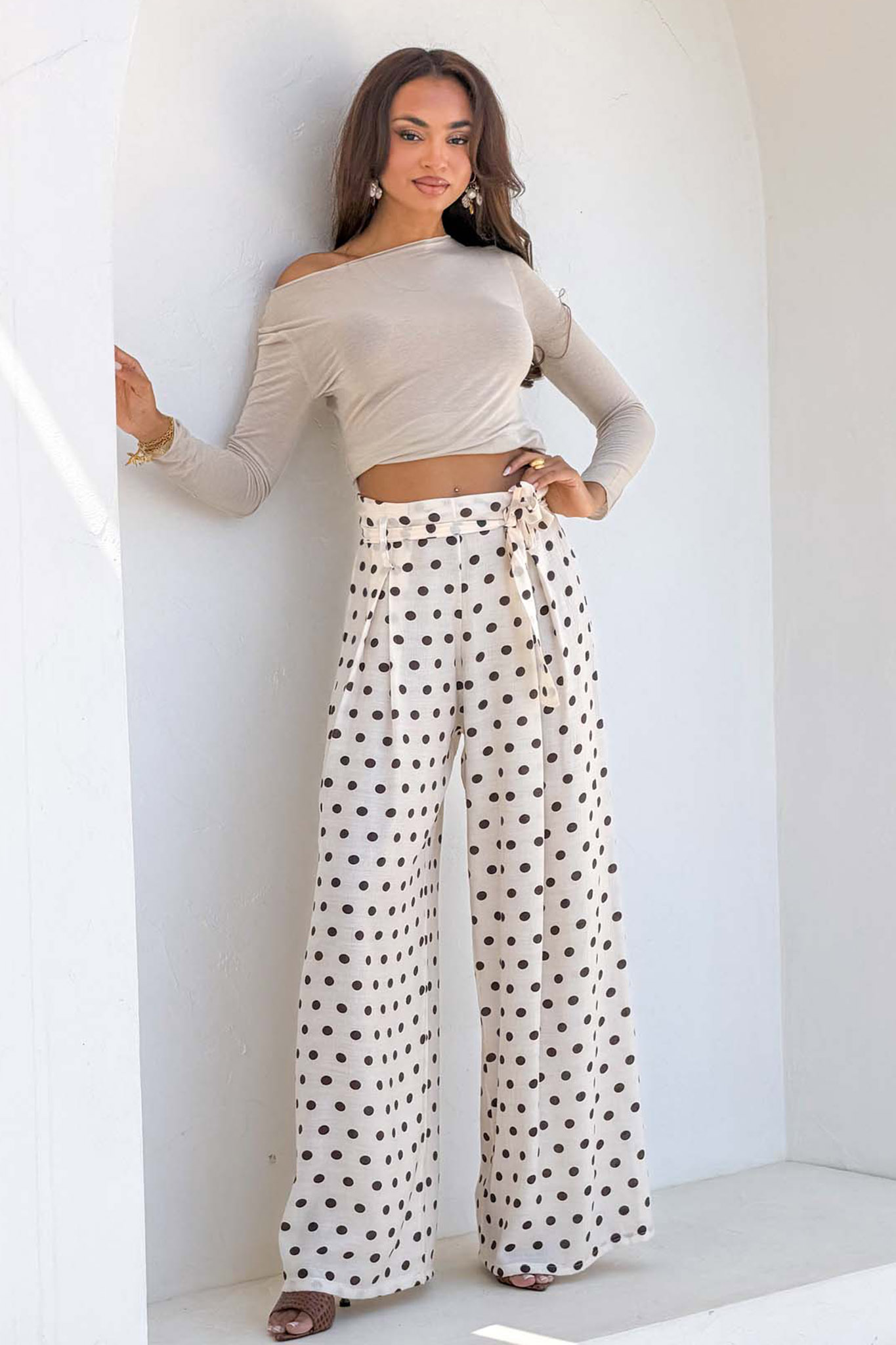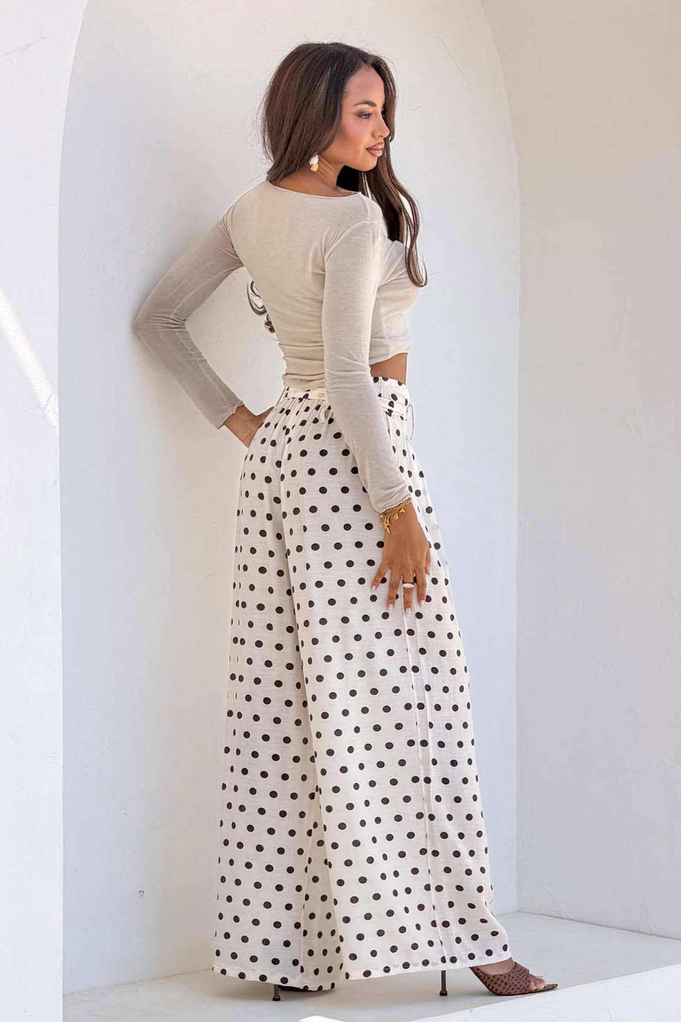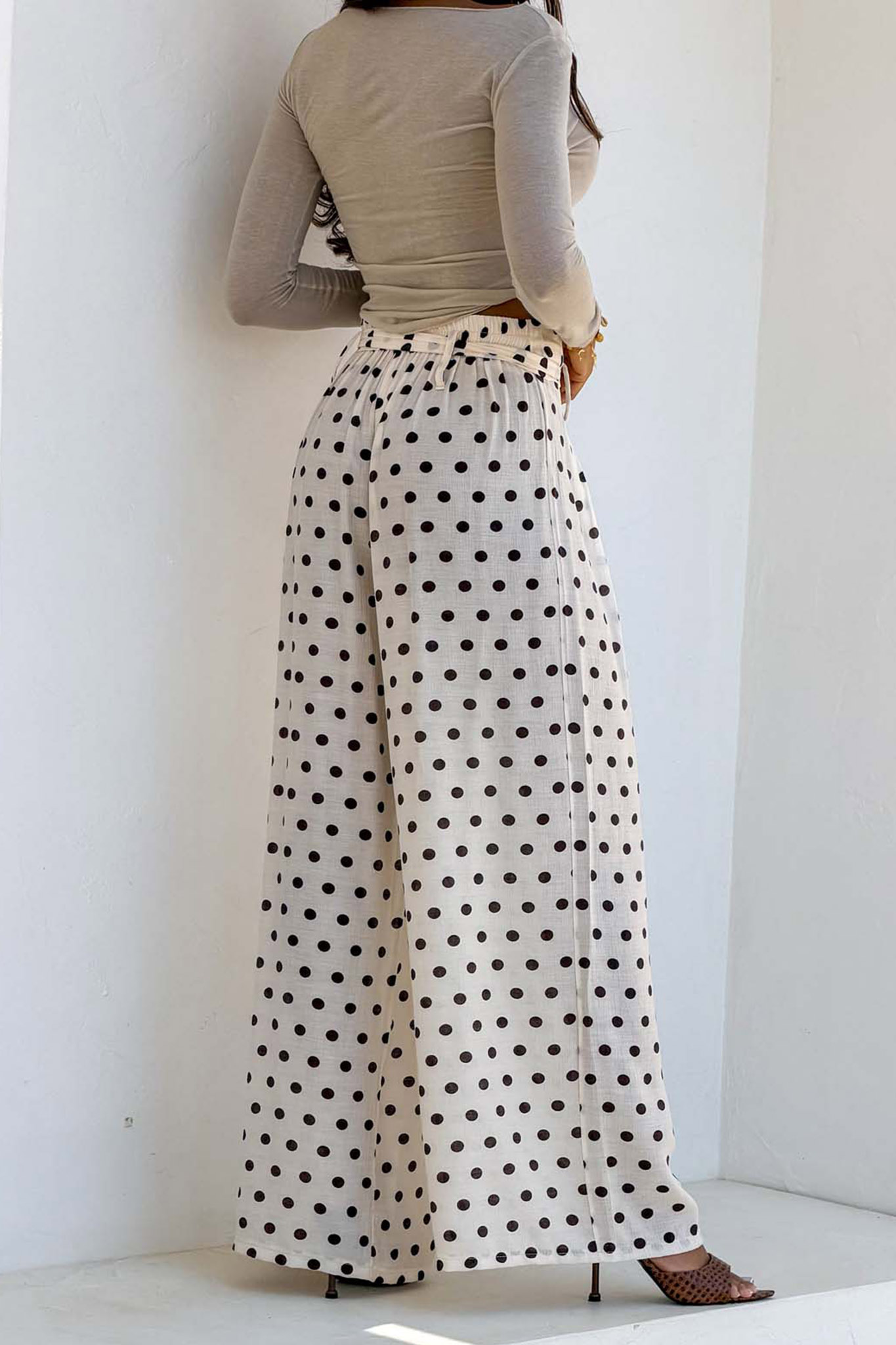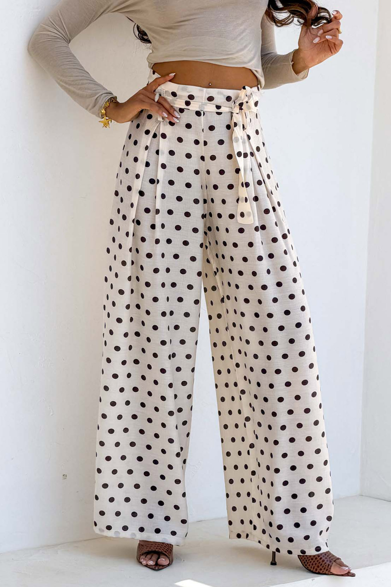 Ψηλόμεσο παντελόνι με φαρδιά μπατζάκια και κλασικό πουά σχέδιο. Διαθέτει ελαστική μέση για άνετη εφαρμογή και μια υφασμάτινη ζώνη που δένει σε φιόγκο στο μπροστινό μέρος, προσθέτοντας μια θηλυκή λεπτομέρεια.