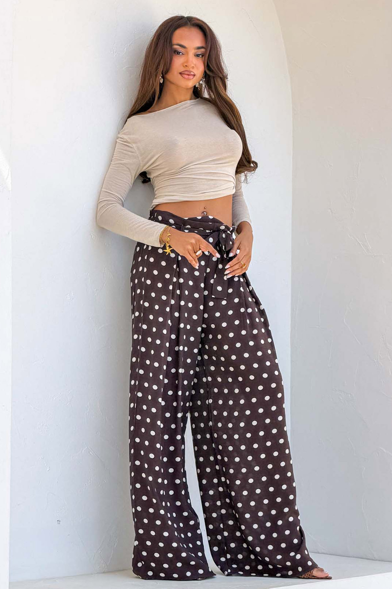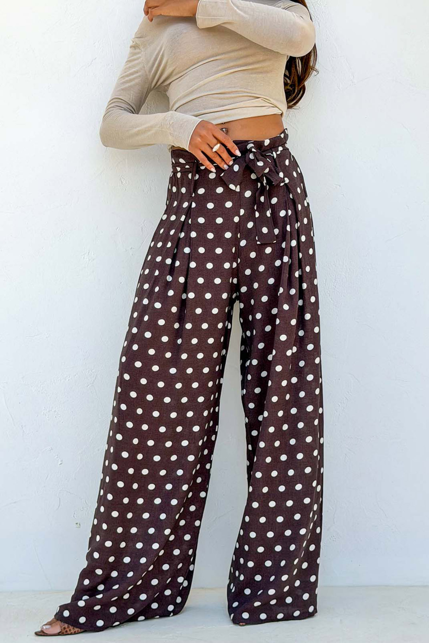 Ψηλόμεσο παντελόνι με φαρδιά μπατζάκια και κλασικό πουά σχέδιο. Διαθέτει ελαστική μέση για άνετη εφαρμογή και μια υφασμάτινη ζώνη που δένει σε φιόγκο στο μπροστινό μέρος, προσθέτοντας μια θηλυκή λεπτομέρεια.