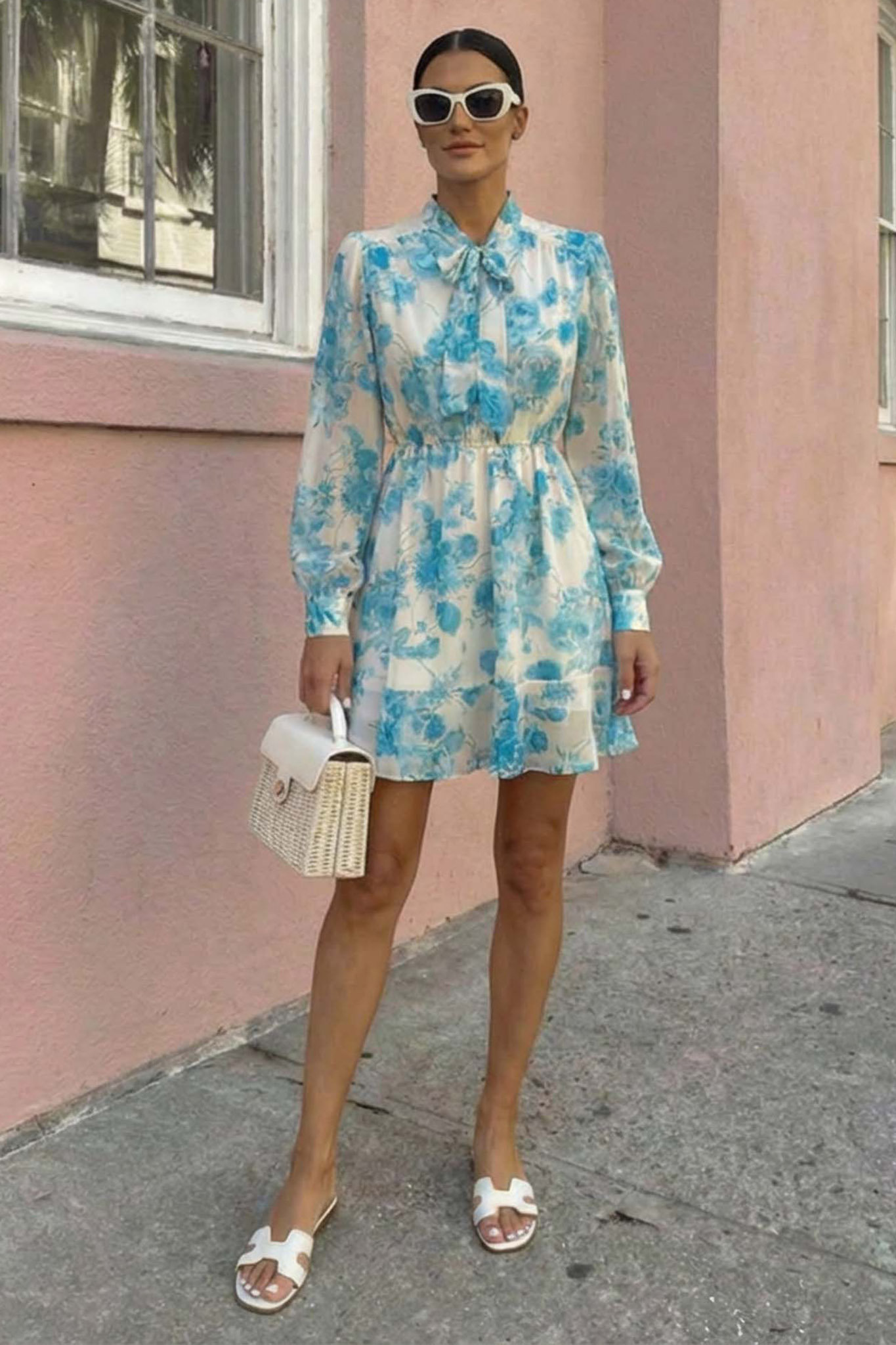 Αυτό το αέρινο φλοράλ μίνι φόρεμα αποτελεί μια κομψή και δροσερή επιλογή για τις καλοκαιρινές σας εμφανίσεις. Διαθέτει ρομαντικό δέσιμο με φιόγκο στον λαιμό, μακριά αέρινα μανίκια με λάστιχο στο τελείωμα και ένα διακριτικό βολάν στη βάση που χαρίζει κίνηση. Η σύνθεσή του συχνά περιλαμβάνει ασημοκλωστή στην ύφανση για μια διακριτική λάμψη, καθιστώντας το ιδανικό για πρωινές βόλτες αλλά και πιο ιδιαίτερες περιστάσεις