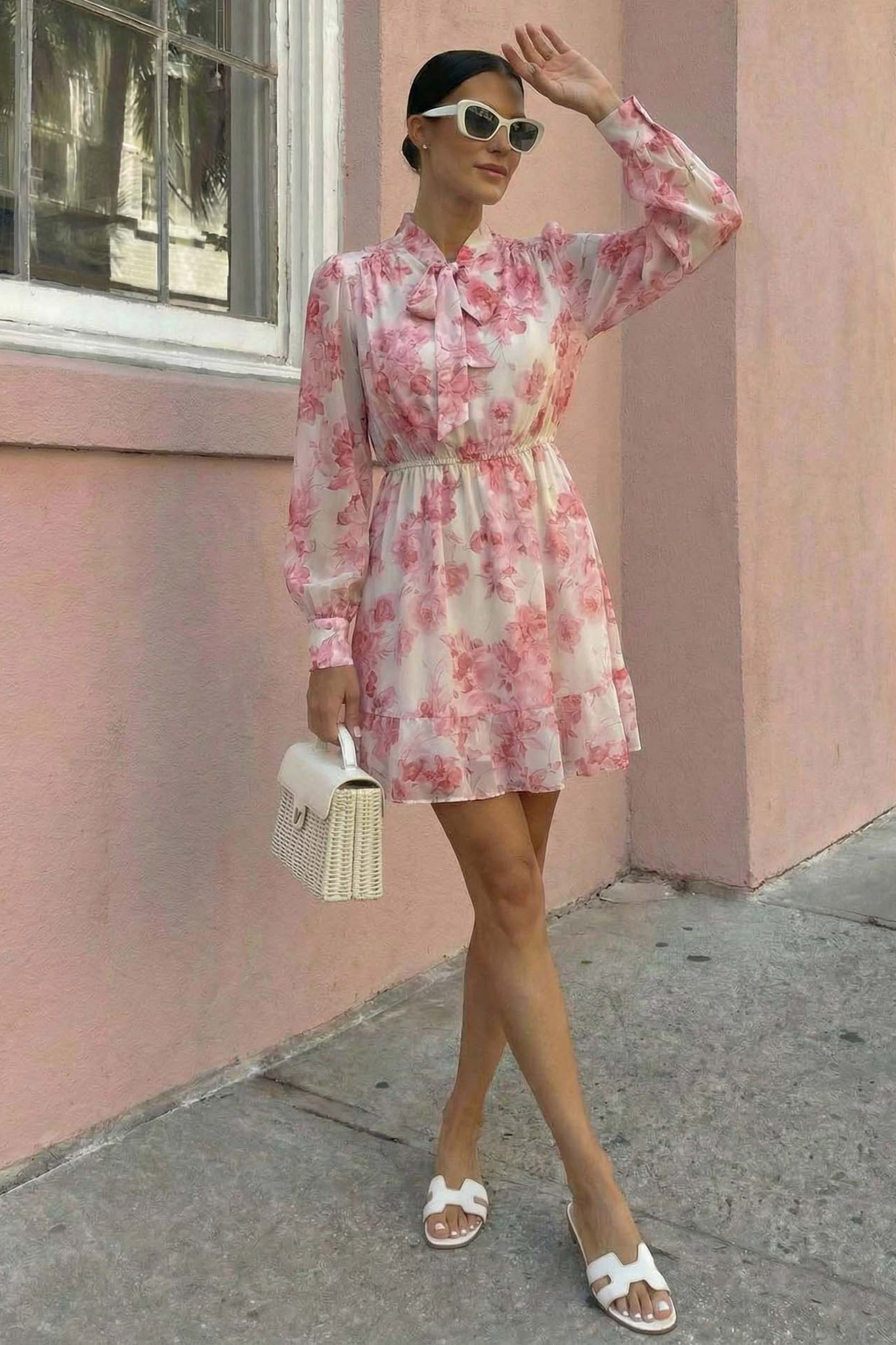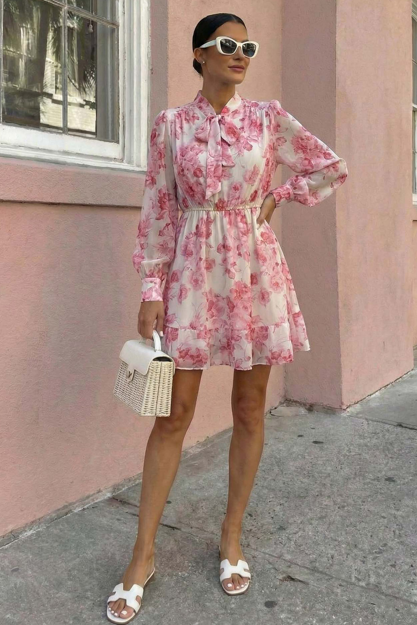 Αυτό το αέρινο φλοράλ μίνι φόρεμα αποτελεί μια κομψή και δροσερή επιλογή για τις καλοκαιρινές σας εμφανίσεις. Διαθέτει ρομαντικό δέσιμο με φιόγκο στον λαιμό, μακριά αέρινα μανίκια με λάστιχο στο τελείωμα και ένα διακριτικό βολάν στη βάση που χαρίζει κίνηση. Η σύνθεσή του συχνά περιλαμβάνει ασημοκλωστή στην ύφανση για μια διακριτική λάμψη, καθιστώντας το ιδανικό για πρωινές βόλτες αλλά και πιο ιδιαίτερες περιστάσεις