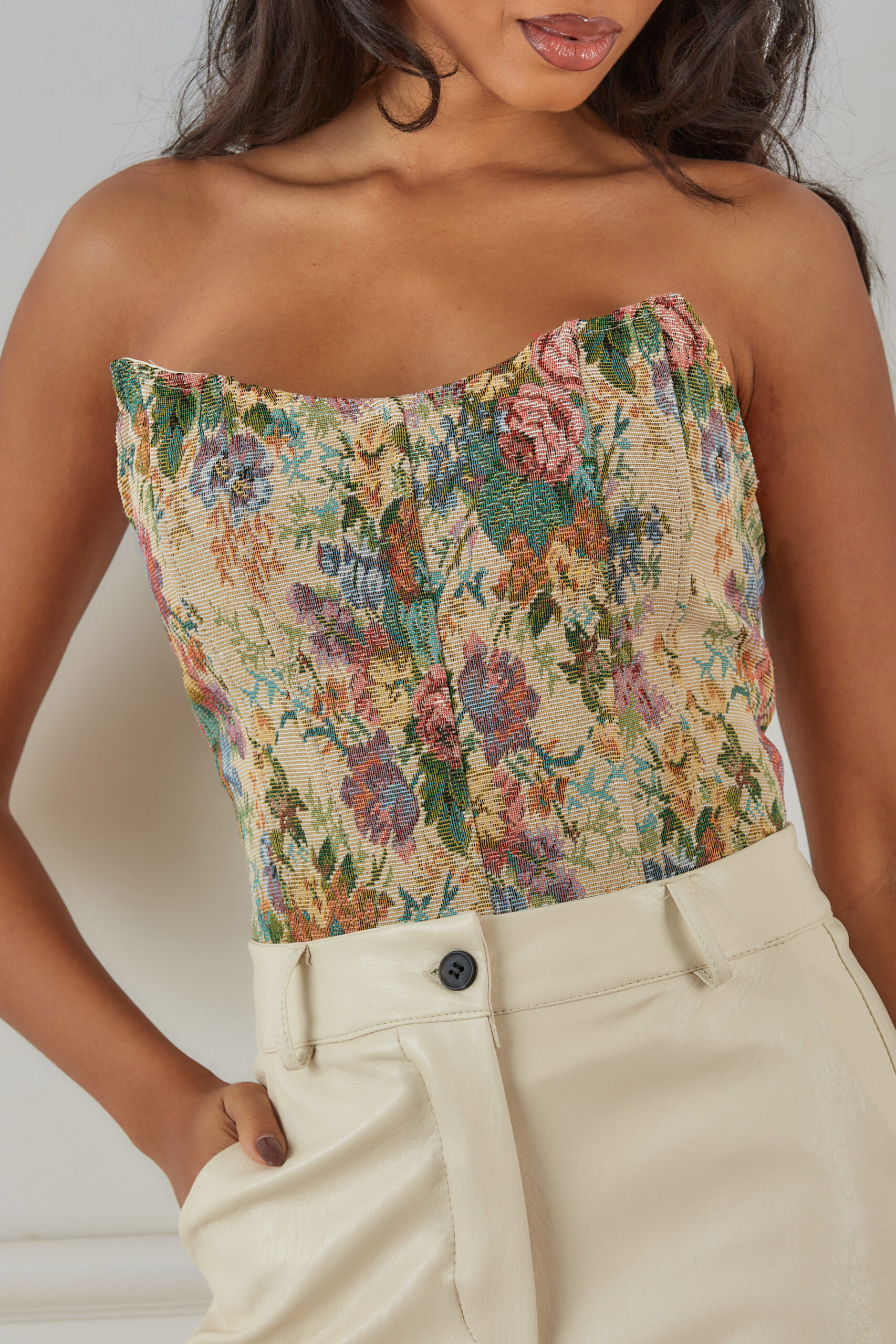Στράπλες κορσέ-τοπ με πολύχρωμο φλοράλ vintage μοτίβο.Ιδανικό για εντυπωσιακές εμφανίσεις.
