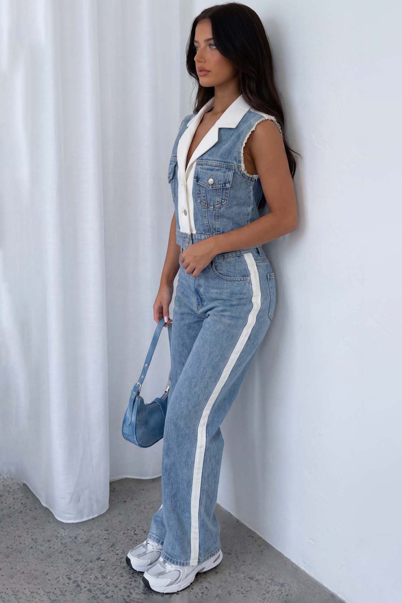 Σετ συνδυάζει την κλασική γοητεία του τζιν με σύγχρονες λεπτομέρειες, δημιουργώντας το απόλυτο look. Το επάνω μέρος αποτελείται από ένα αμάνικο γιλέκο με λευκό γιακά σε αντίθεση, ενώ το σύνολο ολοκληρώνεται με ένα ψηλόμεσο wide-leg παντελόνι που διαθέτει διακοσμητική λευκή λωρίδα στο πλάι για έναν sporty-chic χαρακτήρα. Η άνετη γραμμή του παντελονιού σε συνδυασμό με την εφαρμοστή σιλουέτα του γιλέκου προσφέρουν μια ισορροπημένη και θηλυκή εμφάνιση, ιδανική για εντυπωσιακές casual εμφανίσεις που ξεχωρίζουν.